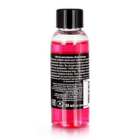 Масло массажное «Eros Fantasy» для эротического массажа. Вызывает ощущение тепла, особенно при дуновении. Повышает чувствительность. Имеет приятный аромат земляники и сладкий вкус. Обеспечивает длительное скольжение. Легко смывается водой.