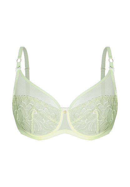 Бюстгальтер Janette M выполнен на косточках, чашки мягкие, с боковой корректирующей сеткой, шитые из сетки в цветочной вышивкой, верх чашки из сетки, бретельки не отстёгиваются, регулируются по длине. Спинка из двух слоев сетки. На спине застёжка на удлинитель, количество крючков в ряду застёжки увеличивается пропорционально размеру бюстгальтера. Фурнитура металлическая цвета желтого золота.