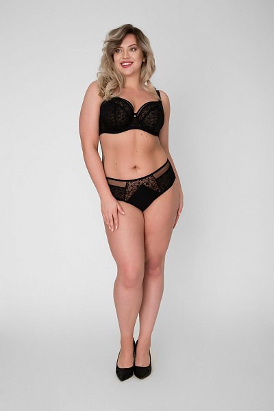 Бюстгальтер выполнен на косточках, с боковыми поддержками для предотвращения скатывания пояса, чашки мягкие шитые из гипюра с цветочным рисунком, с Т-образным швом, продублированы сеткой. Спинка из плотной стабилизирующей сетки. Бретельки пришиты, регулируются по длине, на спине застёжка - удлинитель на крючках, фурнитура металлическая крашеная.