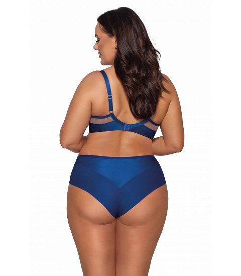 Бюстгальтер Monarch выполнен на основе модели 1030 в цвете Cobalt (кобальт) на косточках, чашки шитые, нижняя часть на тонком поролоне телесного цвета, внутри проложена хлопковым трикотажем, снаружи из сетки, верхняя часть чашки из телесной сетки с вышивкой, напоминающей фактуру крыльев бабочки, армирована силиконовой лентой. Бретельки не отстёгиваются, регулируются по длине, фурнитура цвета меди, пояс из эластичного сетчатого полотна и микрофибры. На спине застёжка на удлинитель, количество крючков в ряду застёжки увеличивается пропорционально размеру бюстгальтера от 2 до 3.